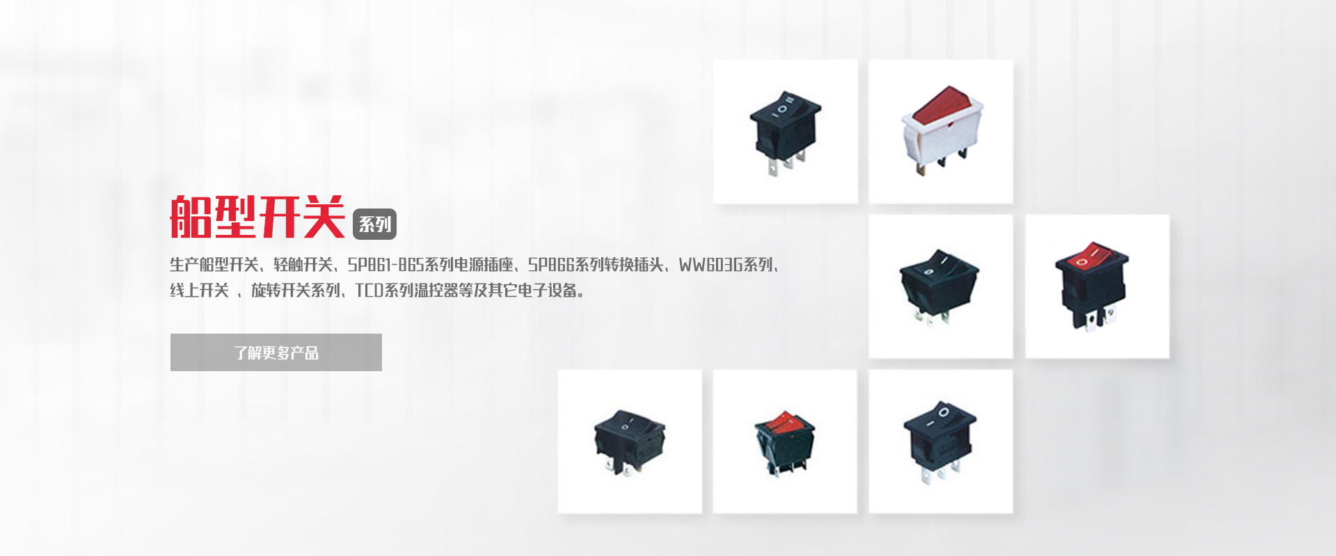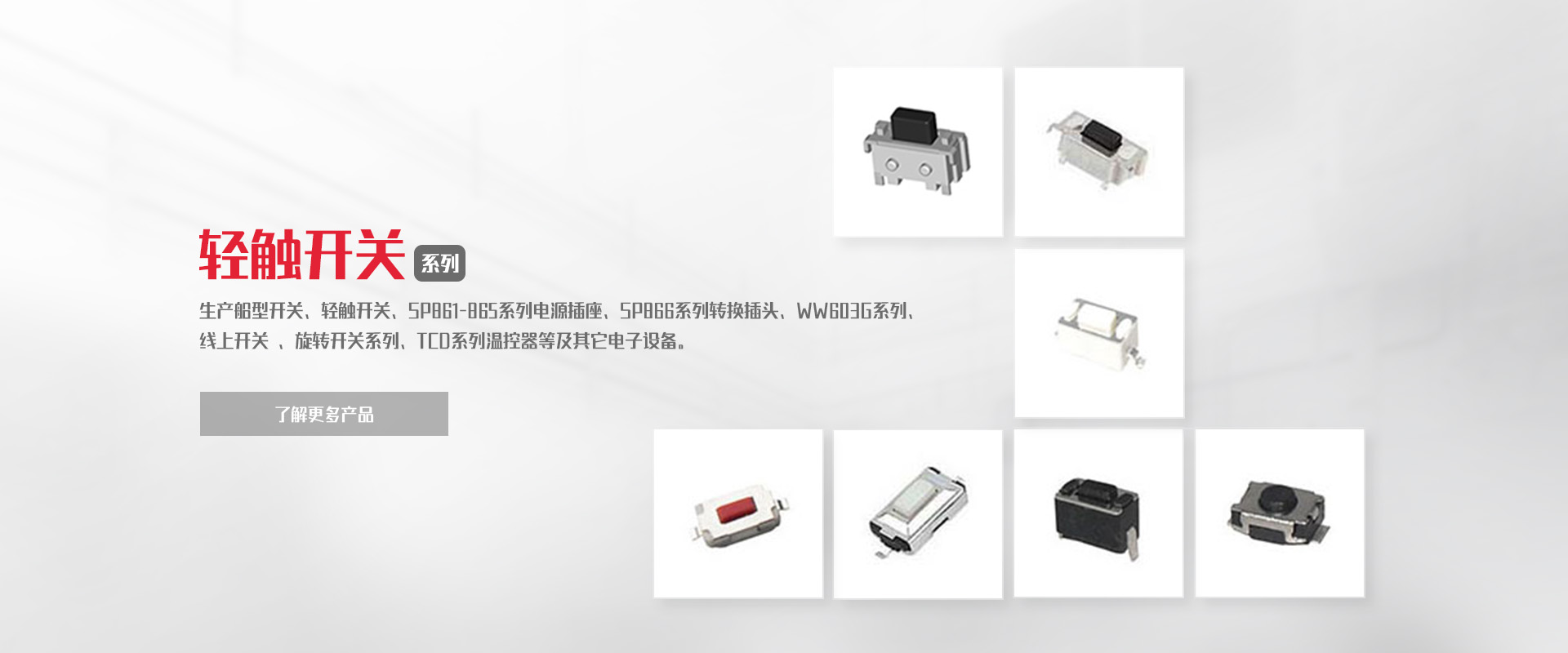 公司專(zhuān)業(yè)生產(chǎn)船型開(kāi)關(guān)、輕觸開(kāi)關(guān)、SP861-865系列電源插座、SP866系列轉(zhuǎn)換插頭、WW11系列微動(dòng)開(kāi)關(guān)、WW01-03、09系列按鈕開(kāi)關(guān)DS、WW系列指示燈開(kāi)關(guān)、WW603G系列 線上開(kāi)關(guān) 、旋轉(zhuǎn)開(kāi)關(guān)系列、TCD系列溫控器等及其它電子設(shè)備。